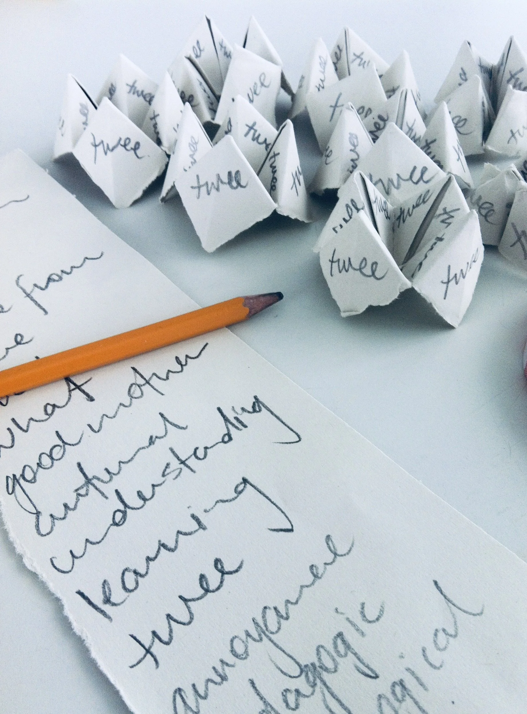 The gingham lid provoked, the folded fortune tellers responded, and the scattered words stayed close. Together, they form a relational assemblage, an enactment of how the everyday, the trivial, the sentimental, the overlooked, carries conceptual and affective force.