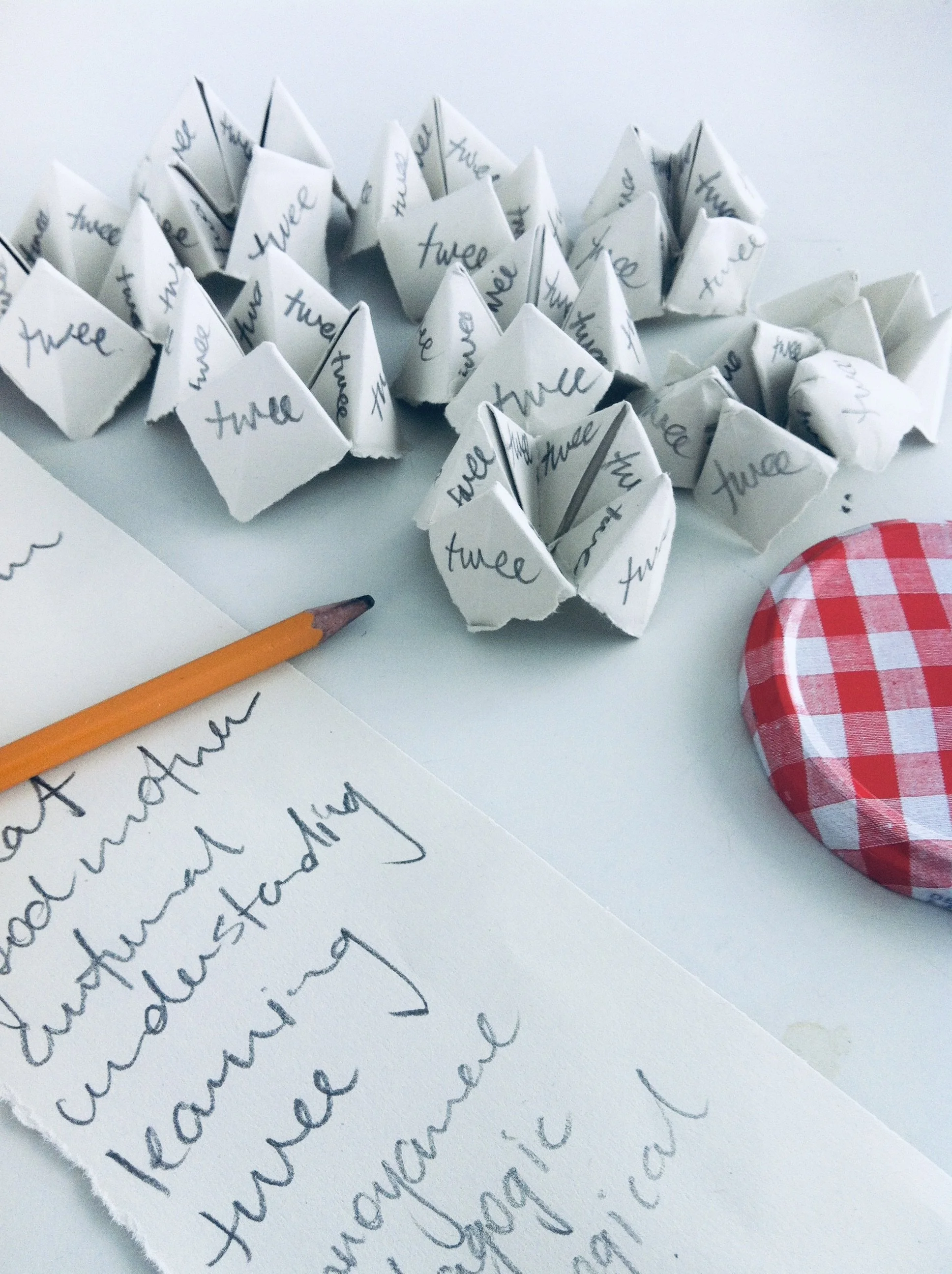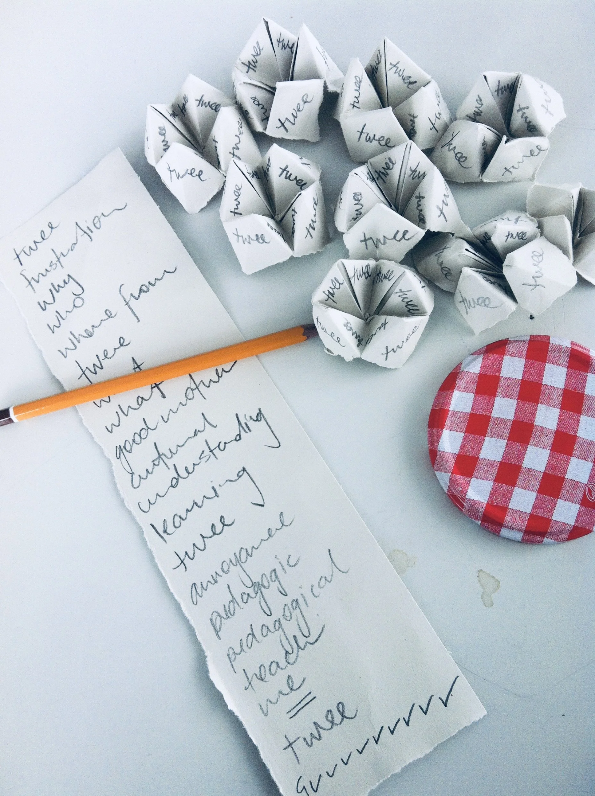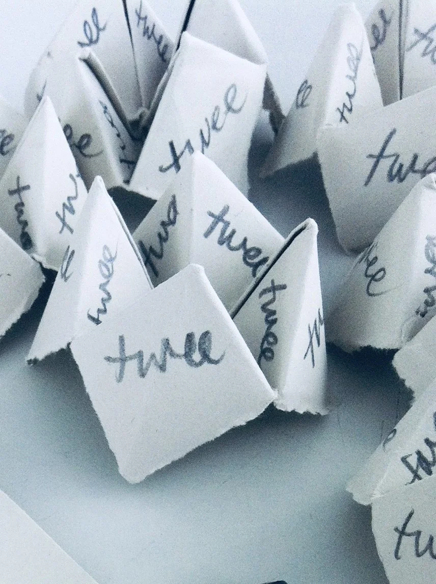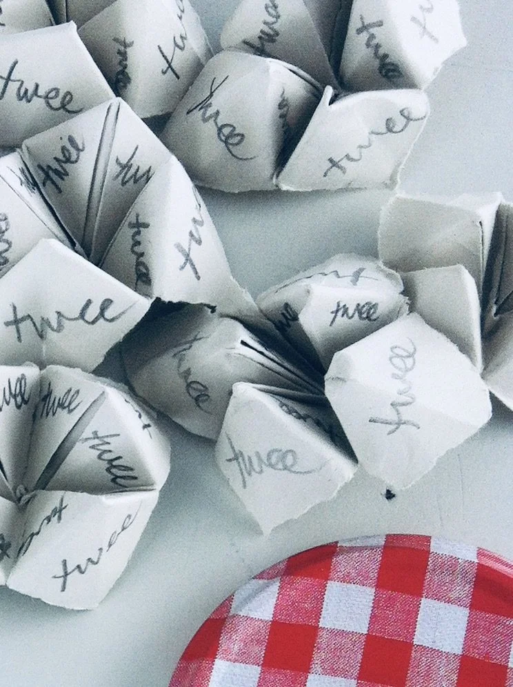 In response, I folded paper. Not just one, but many. The fortune tellers of childhood- multiplied across the space, each one inscribed with the word twee, again and again. This was not a project of resolution or clarity. It was an act of accumulation, a practice of excess. Erin Manning’s notion of the minor gesture helps here: the idea that small, intra-actions can shift the texture of a space, the tone of a moment, without fixing or finalising its tensions. These folds, these repetitions, were minor gestures- not designed to confront or dismantle the gingham’s nostalgic pull, but to sit with it, amplify it, extend it into playful-irritating-poetic clutter.